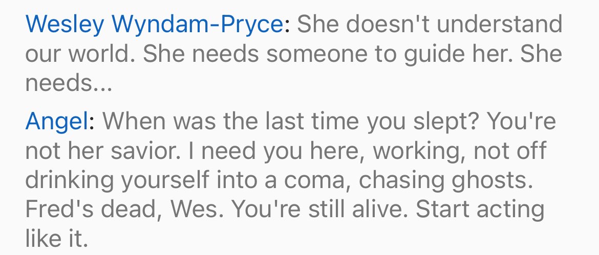 Wesley is grinding something into a paste in a mortar and pestle, mumbling to himself while doing so. Illyria is sitting behind him on the edge of the bed.
