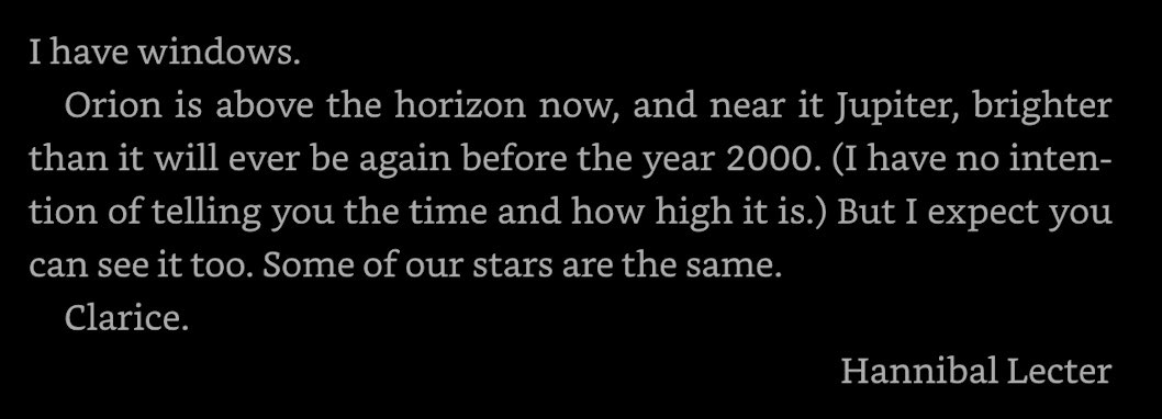 What did Dr Lecter say? “He’s making himself a girl suit out of real girls.” What did he say to me? “Do you sew, Clarice?” Damn straight I do.